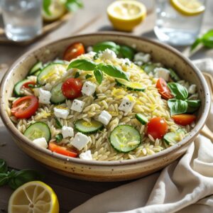 It’s perfect for warm weather, picnics, meal prep lunches, or a quick side dish for dinner. The combination of tangy lemon, fragrant basil, creamy feta, and crunchy cucumbers makes every bite bright and satisfying.